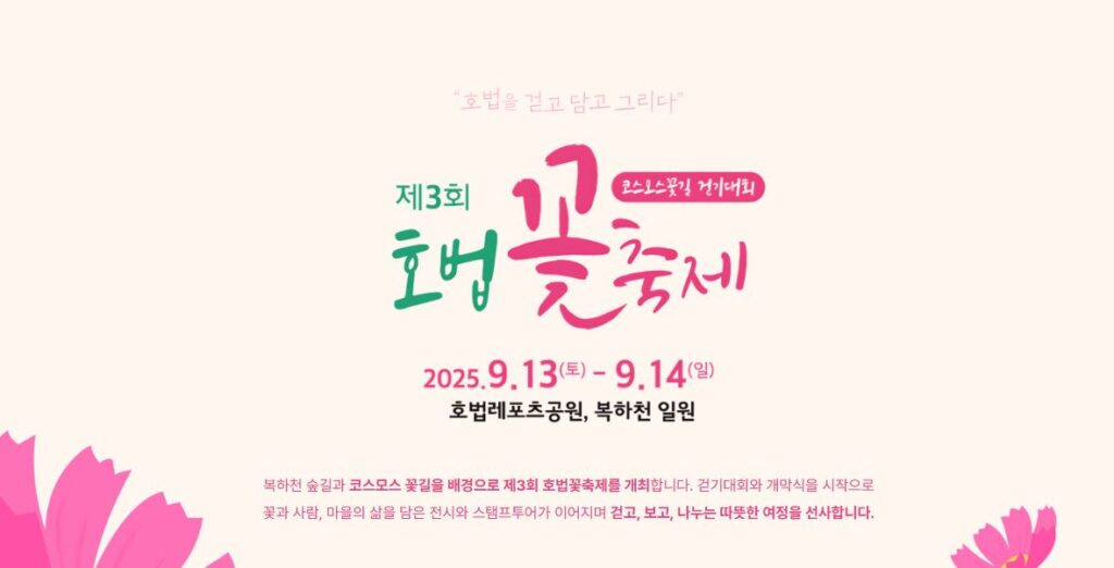 복하천 숲길과 코스모스 꽃길을 배경으로 『제3회 호법꽃축제 – 호법을 걷고 담고 그리다』가 진행됩니다.