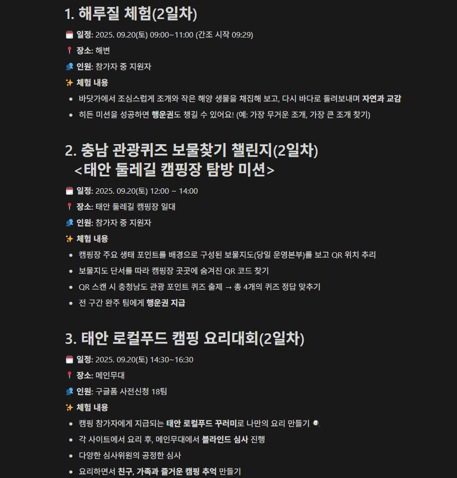 -참가자 혜택 : 2박 3일 캠핑 참여 시 친환경 웰컴키트와 태안 로컬푸드 꾸러미 제공