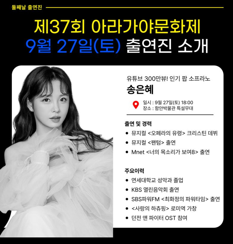 다양한 역사 문화 콘텐츠를 발굴해 찬란한 아라가야의 역사와 문화를 재조명하고 풍성한 축제를 진행하며 다양한 주제공연, 축하 퍼포먼스 등 축제의 장이 펼쳐지는 아라가야문화제가 2025년 9월 26일부터 28일까지 개최합니다.