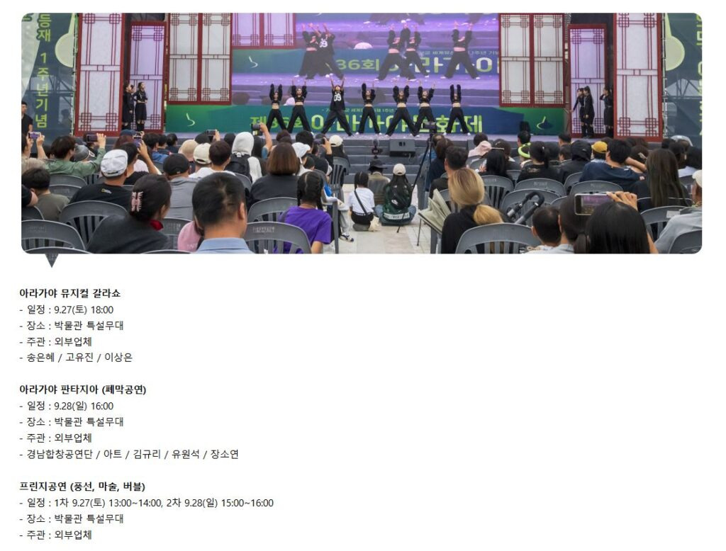 축제와 공연 세부내용과 일정은 축제주관기관으로 문의하여 주시길 바랍니다.