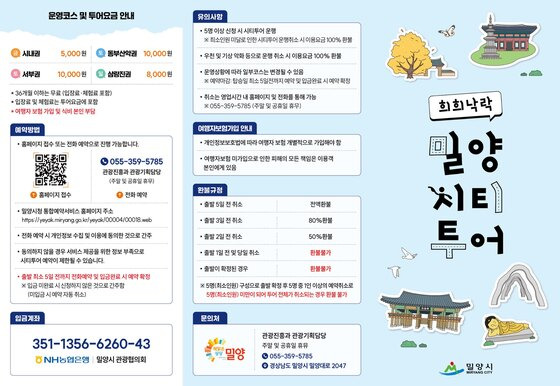 시티투어 이용 요금은 코스에 따라 5,000원에서 36,000원까지다. 예약 및 문의는 밀양시 문화관광 홈페이지, 통합예약시스템 또는 시청 관광진흥과를 통해 가능하다.