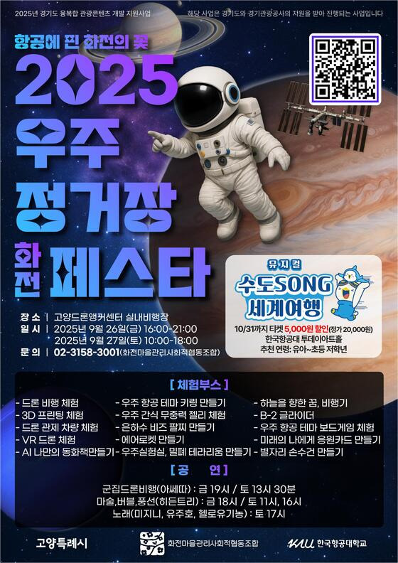 고양특례시(시장 이동환)는 한국항공대학교, 화전마을관리사회적협동조합과 공동으로 오는 26~27일 이틀간 고양드론앵커센터와 한국항공대학교 일대에서 ‘2025 우주정거장 화전 페스타'를 개최한다.