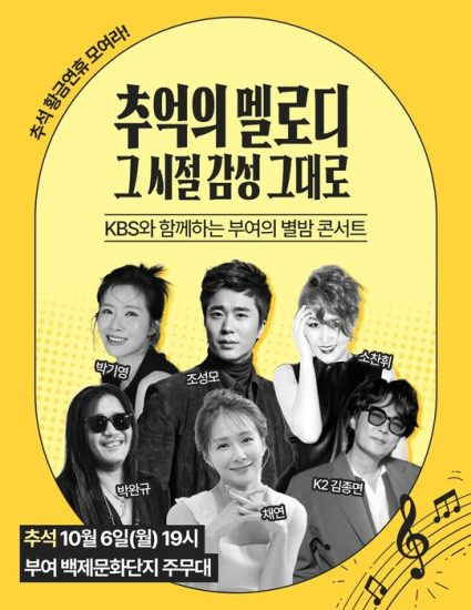 부여군은 오는 10월 6일(월) 추석 당일 저녁 7시, 백제문화단지 주무대에서 KBS와 함께하는 특별 기획 공연 「부여의 별밤 콘서트」를 개최한다고 밝혔다.