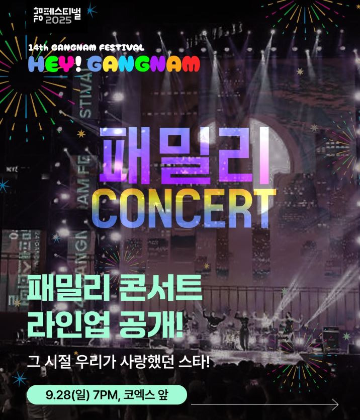 메인 콘서트 : 9.27.(토) 영동대로 K-POP콘서트 / 9.28.(일) 헤이강남 패밀리 콘서트 (코엑스 동측광장,영동대로 특설무대)