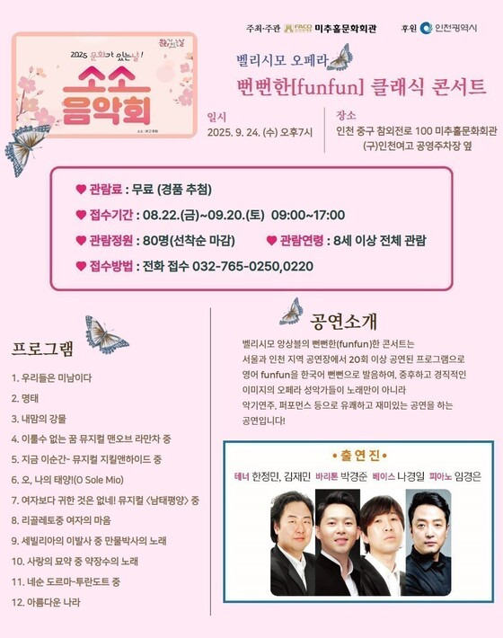 ‘소소음악회’는 인천 시민이라면 누구나 무료로 관람할 수 있으며, 자세한 일정과 내용은 미추홀문화회관 누리집(www.mchart.co.kr)에서 확인할 수 있다.