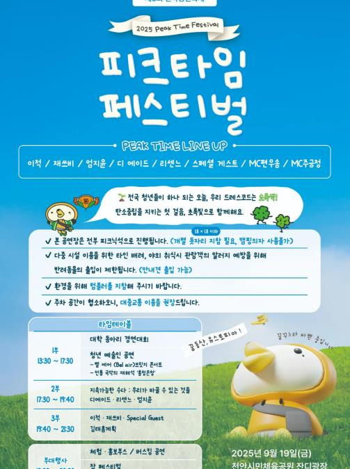 전국청년축제 ‘2025 피크타임 페스티벌’이 오는 19일 천안시민체육공원 잔디광장 일원에서 열린다.