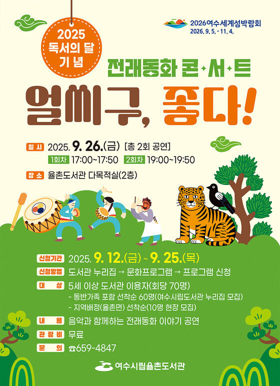 이번 공연은 ‘2025년 여수시립도서관 독서의 달 행사’의 일환으로 마련됐으며 음악과함께 전래동화를 들려주는 무대로 꾸며진다.