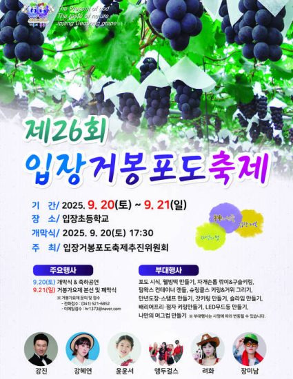 천안시 입장면은 오는 9월 20~ 21일 입장초등학교 운동장에서 제26회 입장거봉포도축제를 개최한다고 12일 밝혔다.
