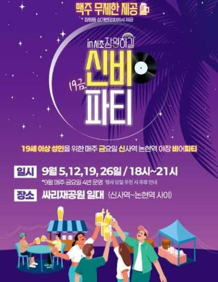 9월 매주 금요일 신사역 및 싸리재공원 일대에서 저녁6~9시에 야장이 진행되는 19금 신비파티 in 서초 축제가 2025년 9월 5일부터 26일까지 개최합니다.