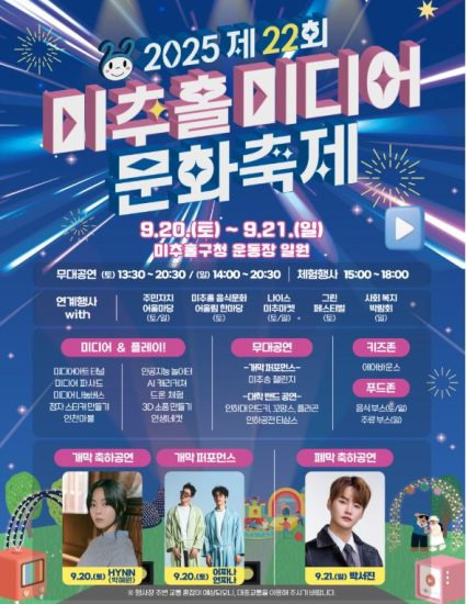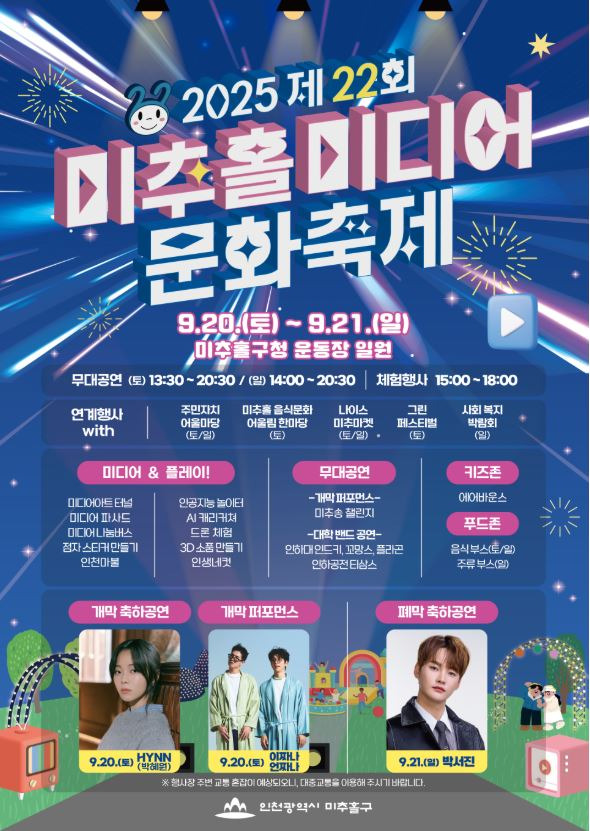 지역 미디어센터인 주안영상미디어센터의 콘텐츠를 비롯하여 최신 미디어 기술과 미디어 아트를 체험하는 종합문화축제인 미추홀미디어문화축제가 2025년 9월 20일부터 21일까지 미추홀구청 운동장 일원에서 개최합니다.