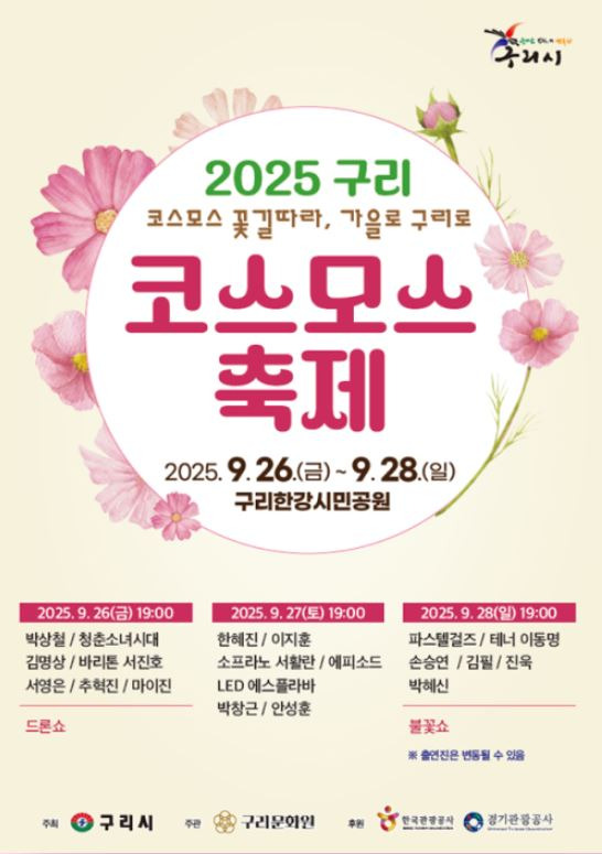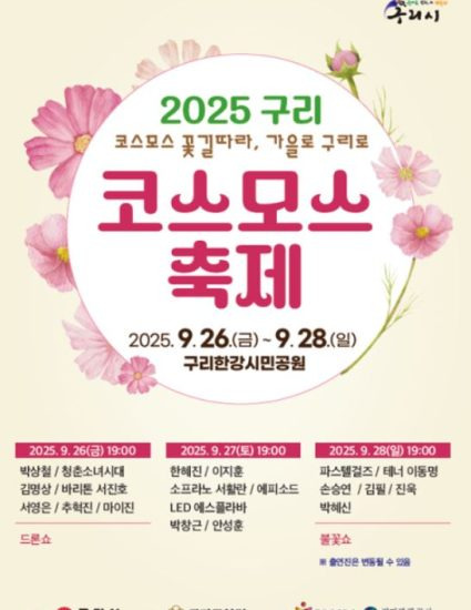 – 2025 구리 코스모스 축제가 9월 26일부터 28일까지 3일간 구리한강시민공원에서 개최