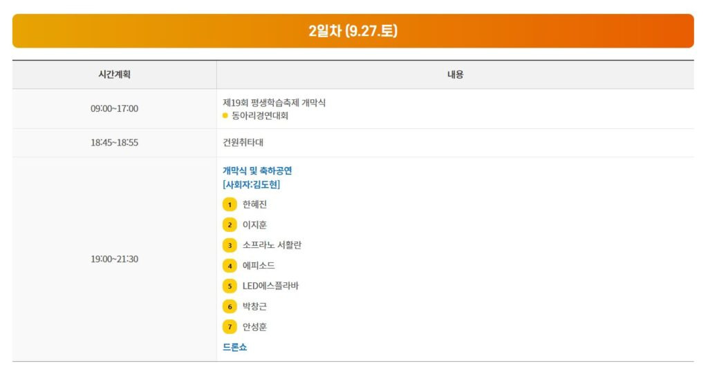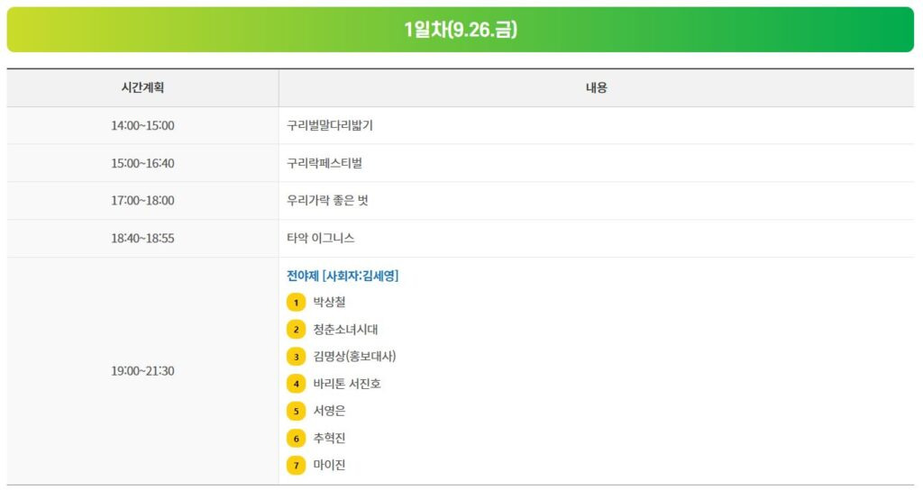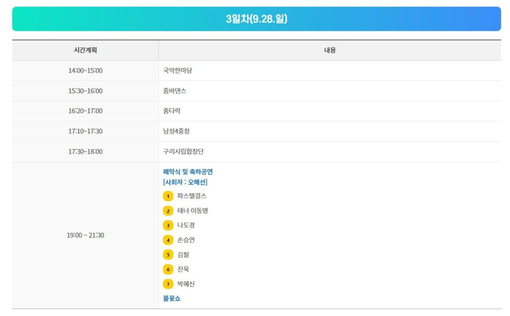 즐길거리 : 구리벌말다리밟기, 옛날교복체험, 7080 추억의 교실, 달고나 만들기, 인셍네컷, 각종 포토존, 시정홍보관, 평생학습축제 체험 부스
