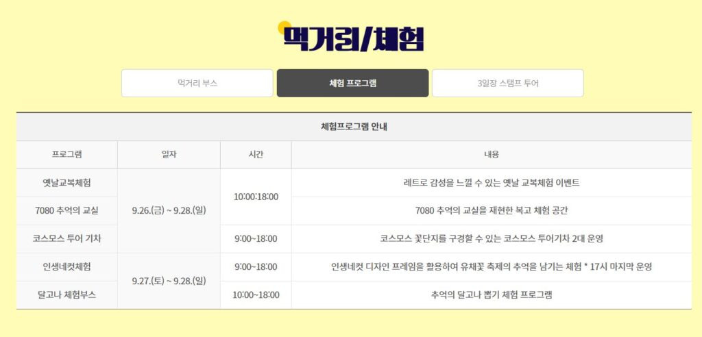 볼거리 : 대규모 코스모스 꽃단지(90,000㎡) 각종 공연 행사: 전야제, 개막식, 폐막식