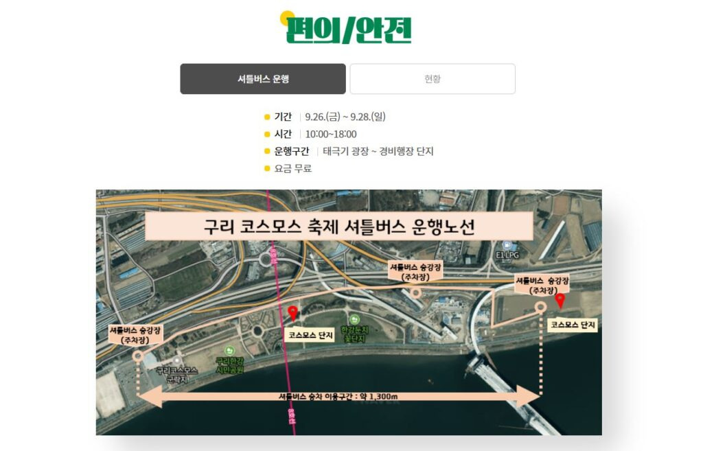 행사장 내에는 셔틀버스를 운영하여 코스모스 단지까지 편리하게 이동할 수 있도록 할 예정입니다.