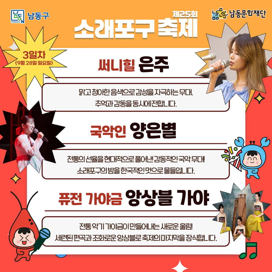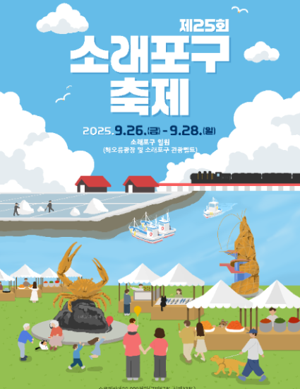 연간 7백만명의 관광객이 찾는 관광명소인 소래포구 축제가 2025년 9월 26일부터 28일까지 인천 소래포구 일원에서 개최합니다.