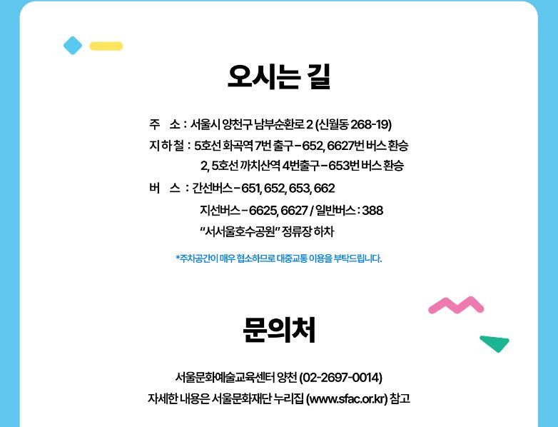 2025년 5월부터 9월까지 매월 마지막주 토요일, 서울문화예술교육센터 양천에서 시기별로 특별한 예술 프로그램을 만날 수 있습니다.