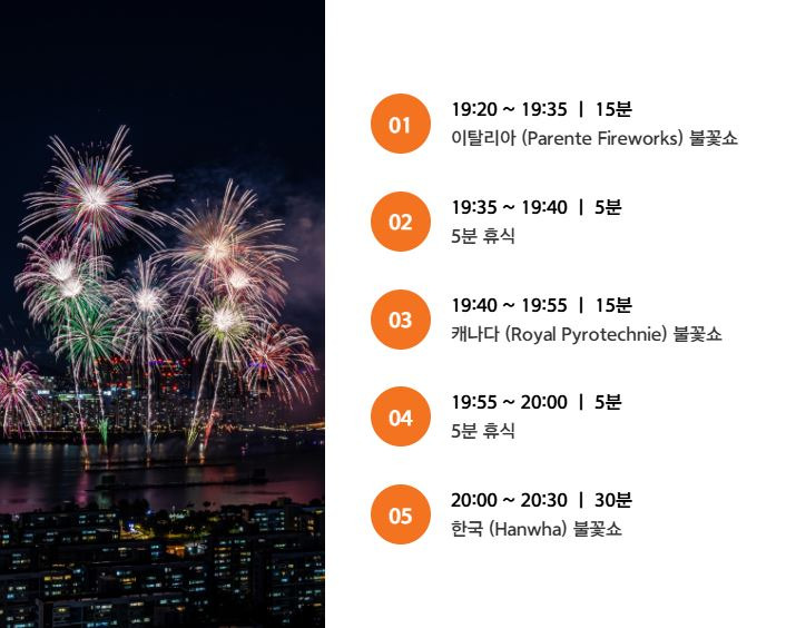 세계적인 수준의 불꽃 전문 기업들이 초청되어 여의도의 밤 하늘을 무대로 환상적인 불꽃 연출을 선보입니다.