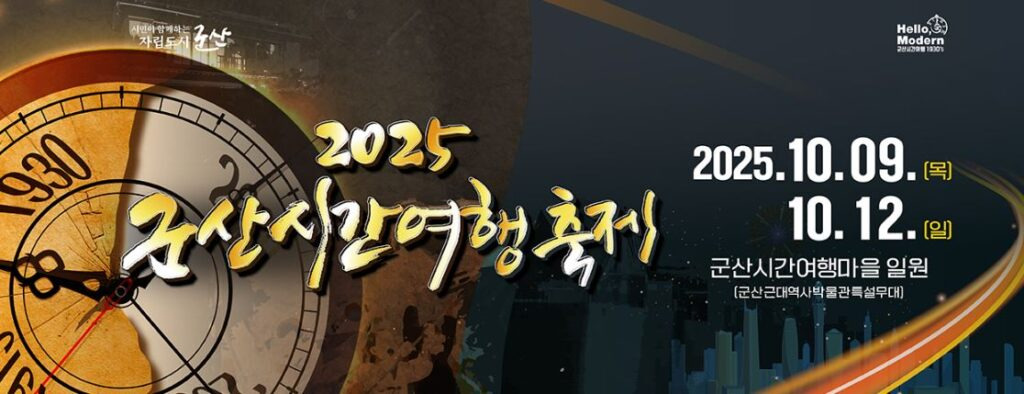 시민들이 함께 만드는 퍼레이드와 퍼포먼스 경연대회 및 근대군산의 역사적 스토리를 담은 군산시간여행축제가 2025년 10월 9일부터 12일까지 군산시간여행마을 일원에서 개최합니다.