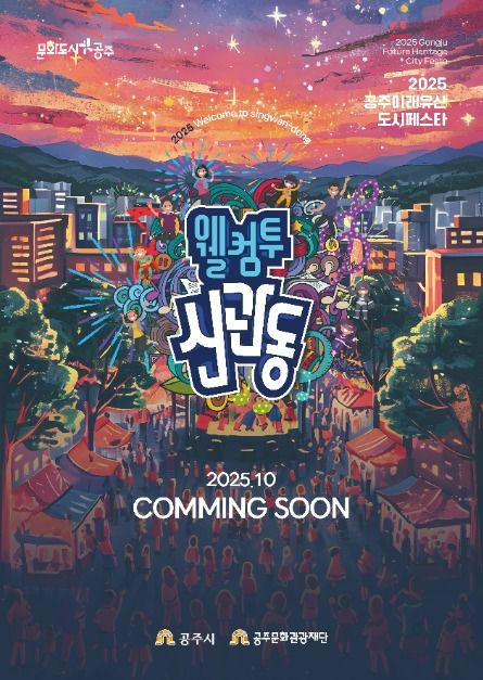 뮤지컬, EDM파티, 프리마켓, 체험 프로그램, 전시, 거리퍼레이드 등 다양한 즐길거리가 준비되어 있는 2025 웰컴투신관동 축제가 2025년 10월 9일부터 11일까지 공주시 공주대학로 일원에서 개최합니다.