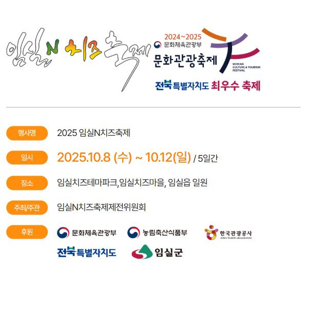 임실만의 차별화 된 임실N치즈라는 고유컨텐츠를 활용하는 2025 임실N치즈축제가 2025년 10월 8일부터 12일까지 개최한다.
