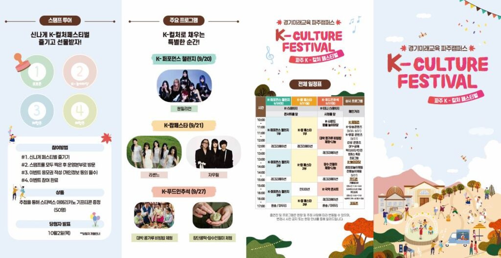 오후석 경기도평생교육진흥원장은 “파주 K-컬처페스티벌은 경기도민 누구나 즐기고 체험할 수 있는 열린 문화축제”라며 “경기북부의 새로운 문화관광 콘텐츠로 자리잡을 수 있도록 지속 지원하겠다”고 말했다.