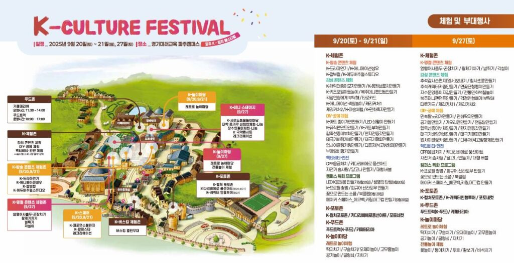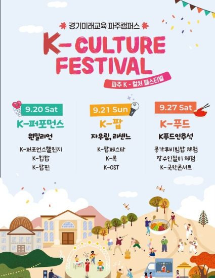 행사는 경기미래교육파주캠퍼스(구 파주 영어마을)에서 진행되며 ▲20일 K-퍼포먼스 ▲21일 K-POP ▲27일 K-푸드 등 회차마다 차별화된 테마로 방문객에게 다양한 한류문화 체험 경험을 제공할 예정이다.
