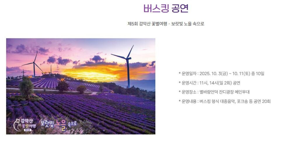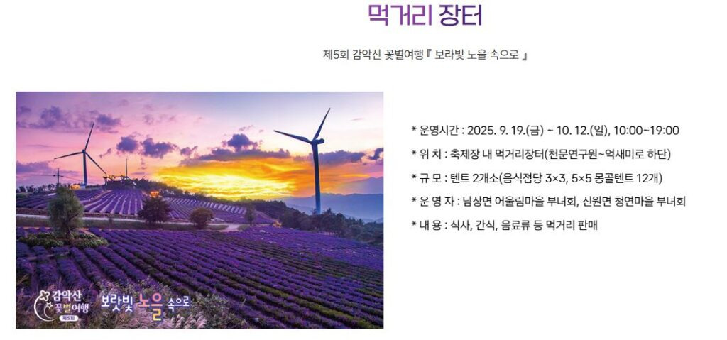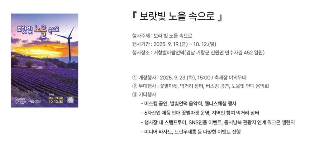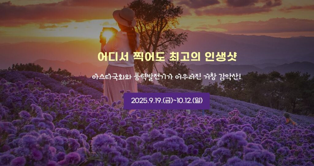 거창군은 오는 9월 19일부터 10월 12일까지 별바람언덕(거창군 신원면 연수사길 452)에서 ‘보랏빛 노을 속으로’로이라는 주제로 ‘제 5회 감악산 꽃&별 여행’ 행사를 개최한다.