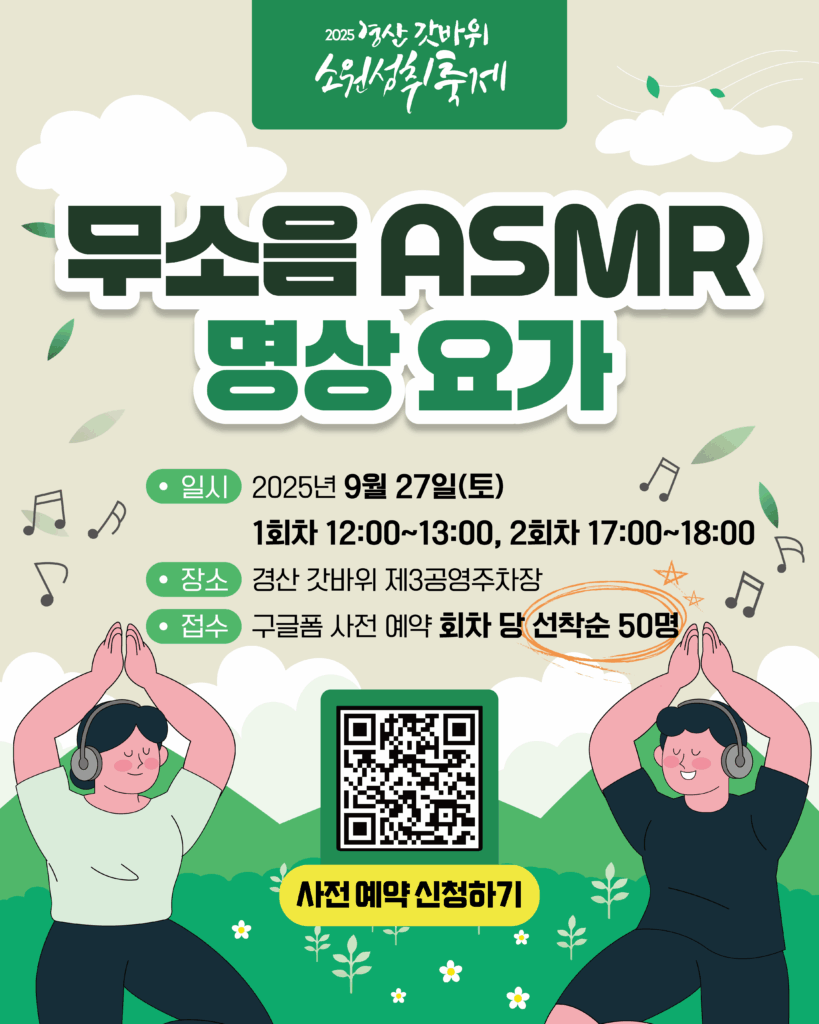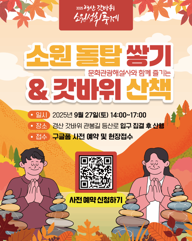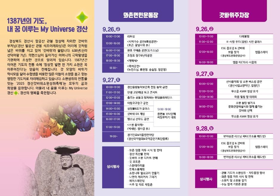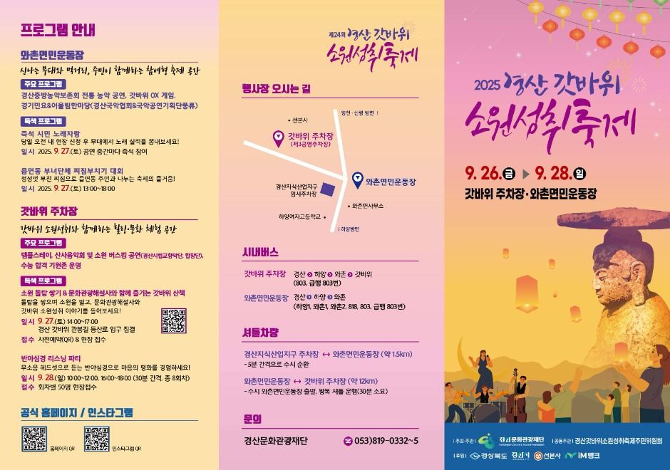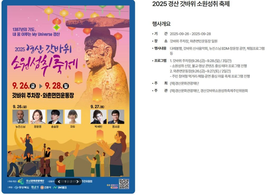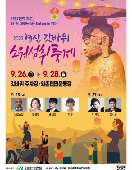 갓바위의 소원성취 전통을 계승하며 전통문화와 현대 공연이 어우러지는 힐링·참여형 행사인 경산갓바위소원성취축제가 2025년 9월 26일부터 28일까지 갓바위 주차장 등에서 개최합니다.