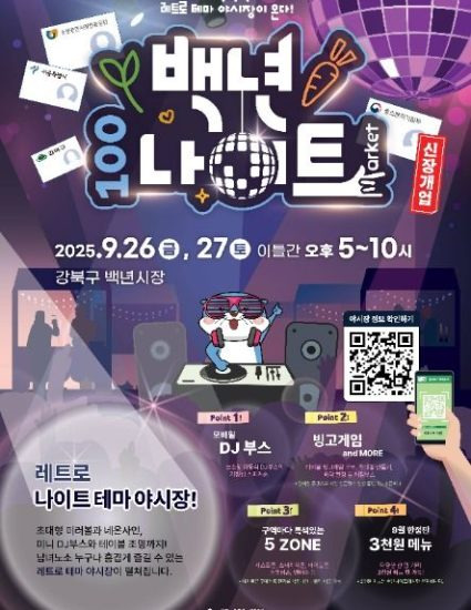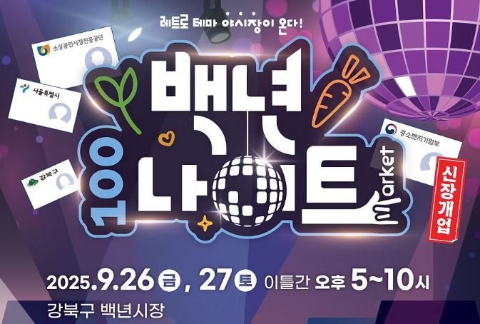 초대형 미러볼과 네온사인, 미니DJ부스가 있어 남녀노소 누구나 즐길 수 있는 레트로 테마의 야시장 2025 백년시장 백년나이트 축제가 2025년 9월 26일부터 27일까지 개최합니다.