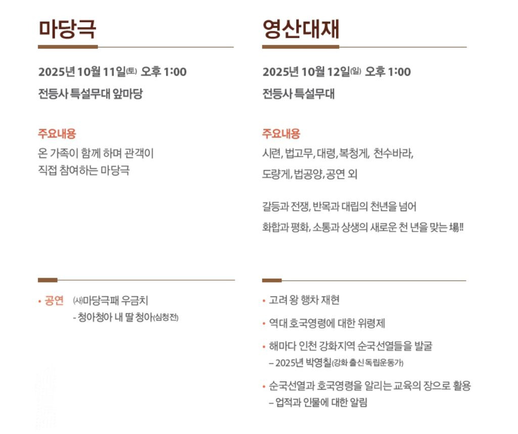 메인프로그램 : 가을음악회 10. 4 19:00 / 마당극 10. 11, 13:00 / 학술세미나 10. 11, 14:00 / 영산대재 10. 12, 13:00