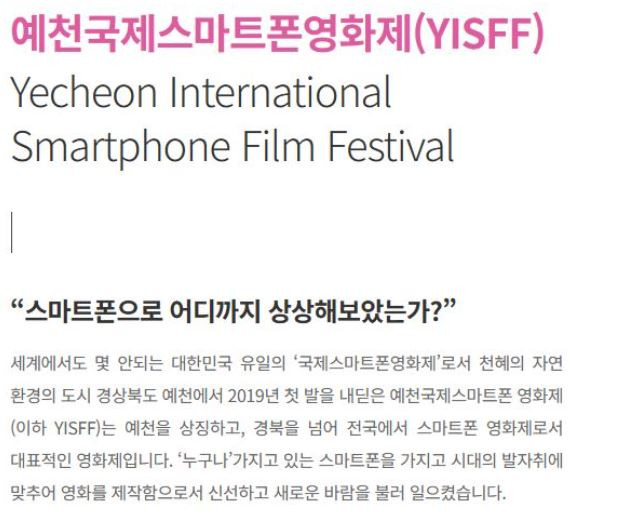 올해로 7회를 맞은 국내 유일의 국제 스마트폰 영화축제인 ‘제7회 예천국제스마트폰영화제’가 오는 27일 개막식을 가지며, 전야제 및 상영회 등 다채로운 행사가 26일부터 28일까지 진행된다.