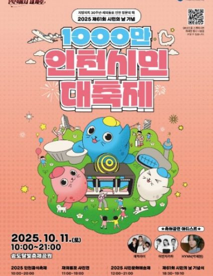 재외동포협력과가 주관하는 ‘재외동포 사진전’은 오전 11시부터 저녁 7시까지 열려 인천과 세계를 잇는 정체성을 조명한다. 예술정책과 주관의 ‘2025 시민문화예술제’는 낮 12시부터 밤 9시까지 3부로 진행되며, 에픽하이·어반자카파·HYNN(박혜원) 등이 무대에 올라 풍성한 공연을 선사한다.