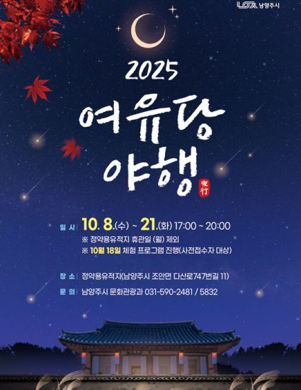 특히 야행 기간 중 10월 18일에는 ‘제39회 정약용문화제’가 열리는 날과 맞물려, ‘여유당 별빛산책’이 함께 운영된다. 사전 신청자 300명을 대상으로 운영된다. 해당 프로그램은 9월 24일부터 ‘남양주시 통합예약포털’을 통해 신청할 수 있으며, 선착순으로 접수한다.