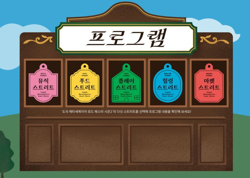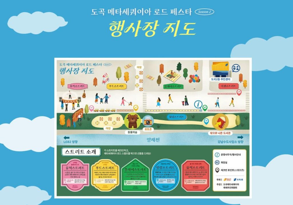 도곡 메타세콰이아 로드 페스타는 지난 번과 동일하게 마켓 스트리트(프리마켓), 뮤직 스트리트(음악회), 푸드 스트리트(먹거리존), 플레이 스트리트(원데이클래스)와 더불어 ‘밖으로 나온 도서관’를 설치하여 운영합니다.