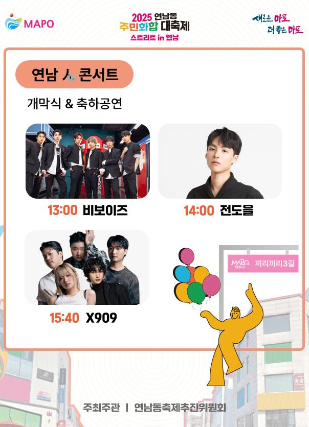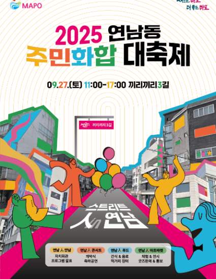 주민 간 교류와 소통을 촉진하고, 지역 공동체 형성을 지원하는 목적을 가지고 있는 2025 연남동 주민화합 대축제가 2025년 9월 27일 연남동 끼리끼리3길 일원에서 개최합니다.