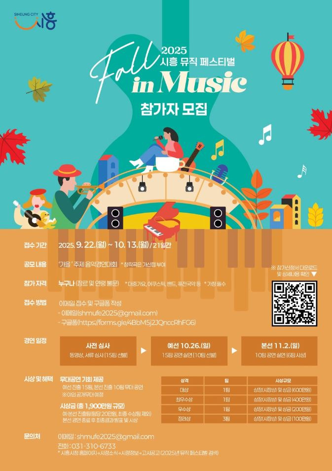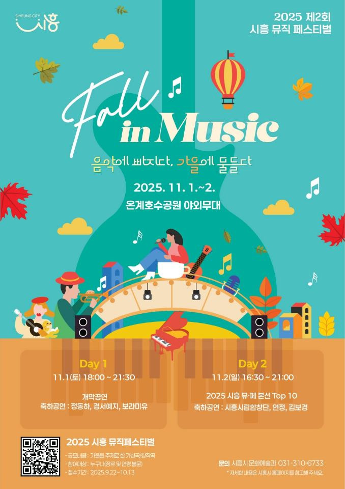 시흥시(시장 임병택)는 오는 11월 1일부터 2일까지 시흥 은계호수공원에서 ‘2025년 제2회 시흥뮤직페스티벌’ 개최를 앞두고 참가팀을 모집한다. 올해 페스티벌 주제는 ‘시흥 Fall in Music -음악에 빠지다, 가을에 물들다- ’로 ‘가을’을 주제로 한 다양한 장르의 전국 단위 음악경연대회 및 축하공연으로 꾸며진다.