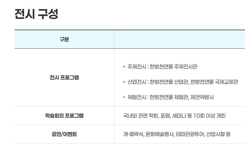 한방과 천연물 산업의 현재와 미래를 만날 수 있는 주제 전시와 산업 전시를 비롯해, 천연물 체험 프로그램, 남녀노소 누구나 즐길 수 있는 다양한 문화공연 및 부대행사 등이 펼쳐집니다.