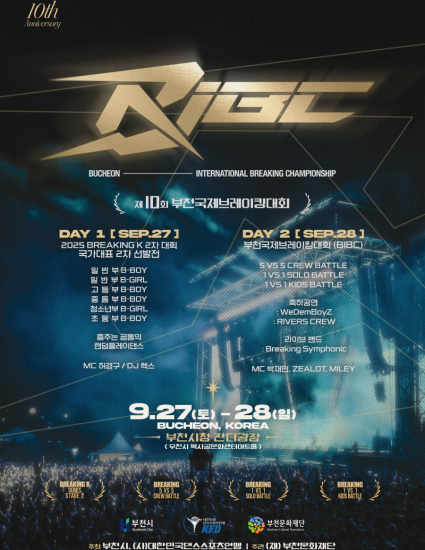 제10회 부천국제브레이킹대회(BIBC)가 2025년 9월 27일부터 28일까지 이틀간 부천시청 잔디광장에서 개최합니다.
