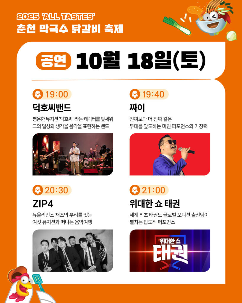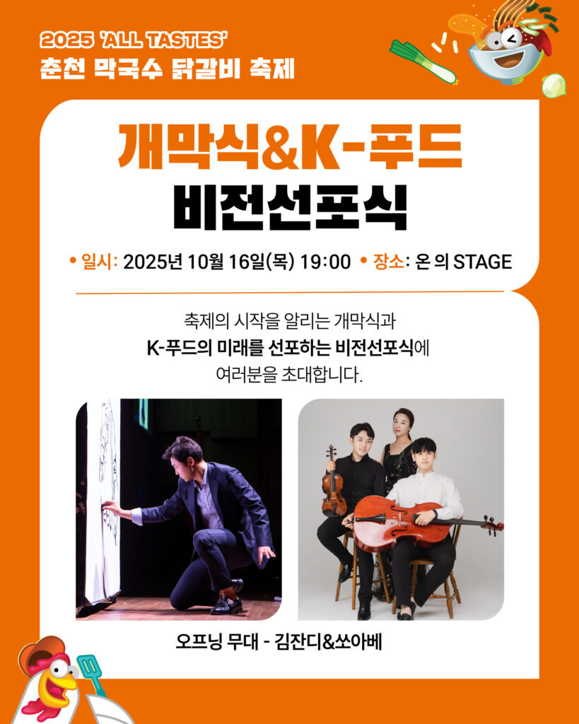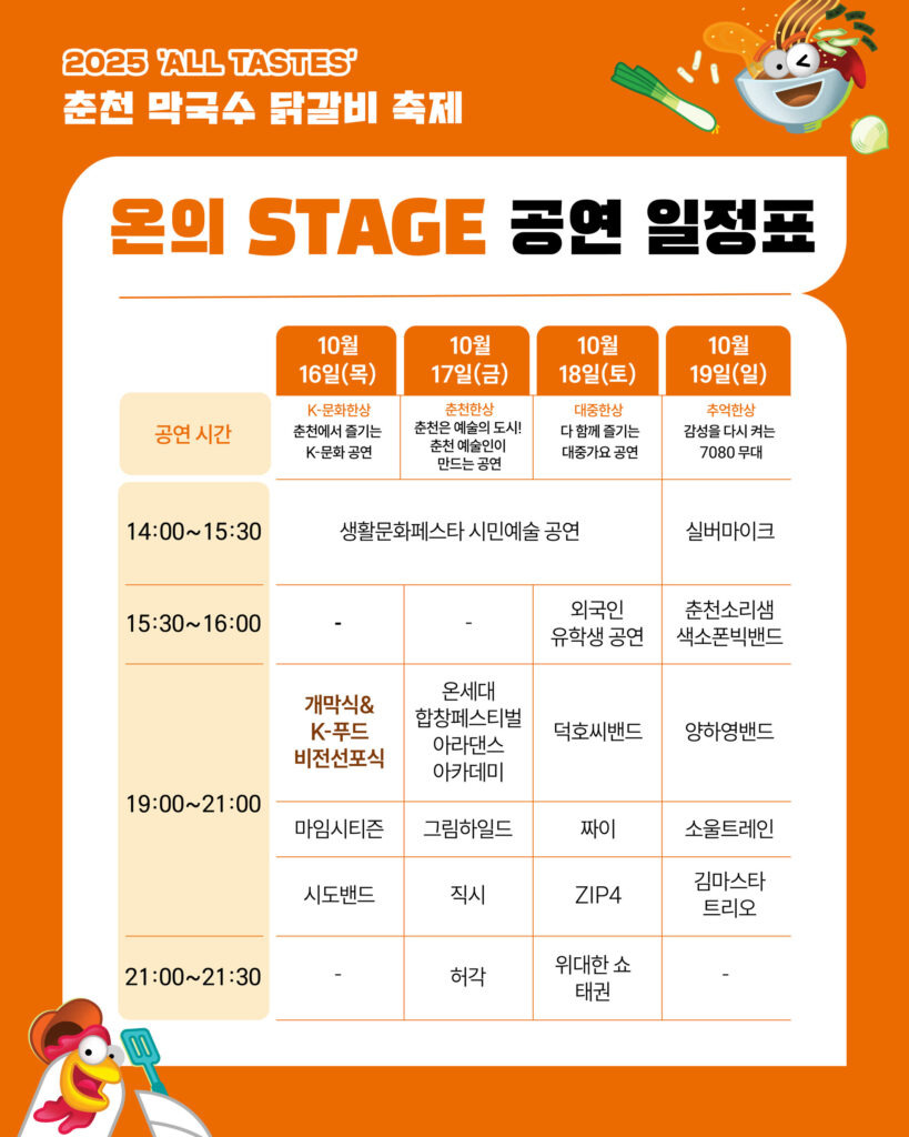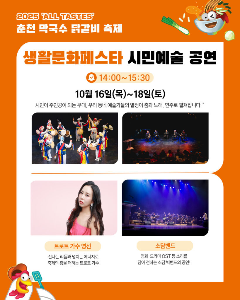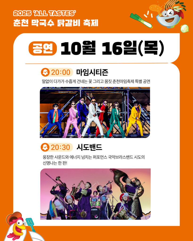 2025년 10월 16일 개막을 시작으로 10월 19일까지 각종 체험부스, 인기가수 축하공연 등 다양한 볼거리와 체험형 프로그램으로 춘천에서 즐기는 막국수, 닭갈비를 경험할 수 있는 축제가 개최합니다.