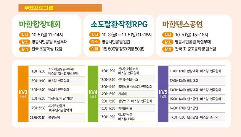 부대프로그램 : 마한합창대회, 렉처콘서트(최태성), 마한댄스공연, 지역농악, 신나는 예술버스, 백제역사유적지구 세계유산등재 10주년 기념 음악회 및 시민의날 가요제
