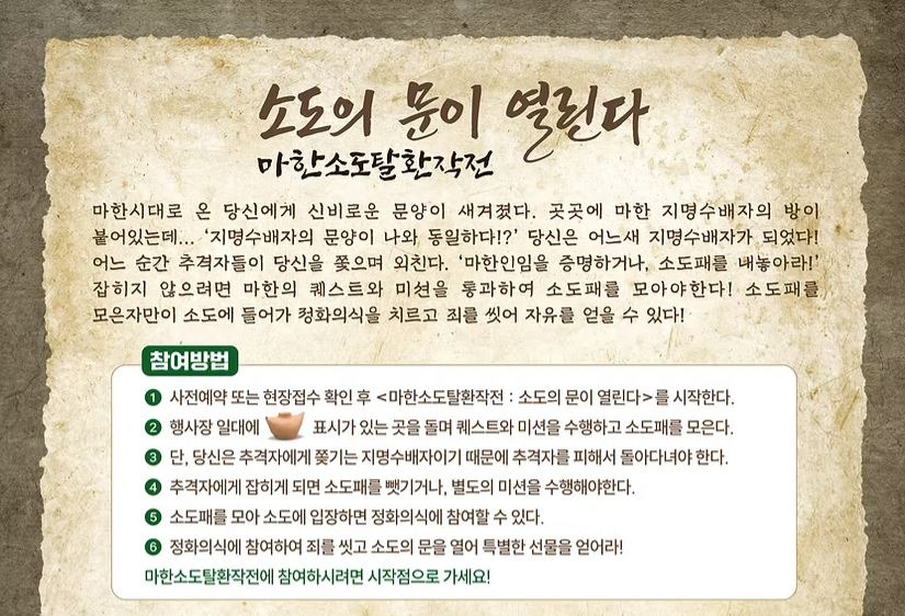 또 마한인 모습을 재현해 보는 의복, 문신, 장신구, 상투 체험이 준비돼 있다. 마한인의 일상 생활을 들여다보는 집 만들기, 불 피우기, 고기 굽기, 토기 만들기, 활쏘기, 공방 체험 프로그램도 마련됐다.