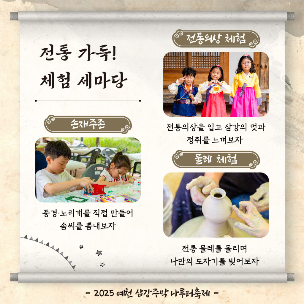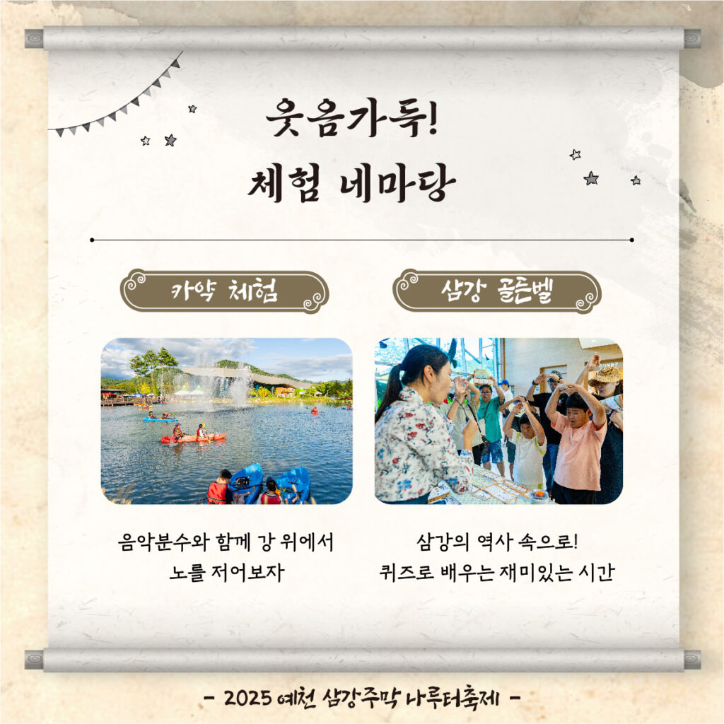 체험 : 스탬프 투어, 보부상운동회, 삼강놀이터, 카약체험, 물레체험, 전통의상 체험 등