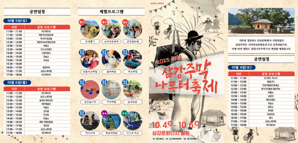 2025년은 “삼강에서 흥겹게! 주막에서 정겹게!” 라는 주제로, 삼강문화단지·삼강주막·강문화전시관·회룡포 등 예천의 대표 관광자원과 함께 세대와 세대를 잇는 다채로운 체험과 공연으로 꾸며집니다.