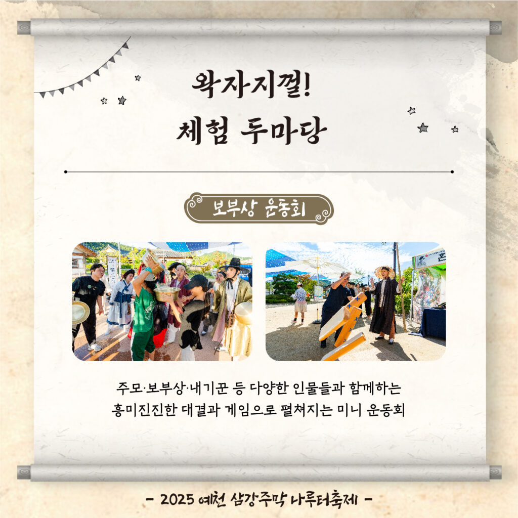 K-세일즈맨, 보부상운동회, 삼강골든벨, 펫놀이터, 어린이공연, 전통문화체험, 카약체험, 오락체험,전통의상체험, 삼삼오오버스킹 등의 프로그램이 준비되어 있습니다.