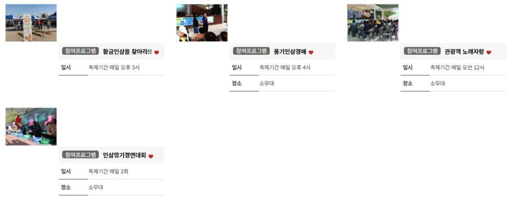 소비자 참여 프로그램 : 인삼깎기 경연대회, 인삼병주 만들기, 인삼 인절미 떡메치기, 관광객 노래자랑, 풍기인삼 경매, 황금인삼을 찾아라 !
