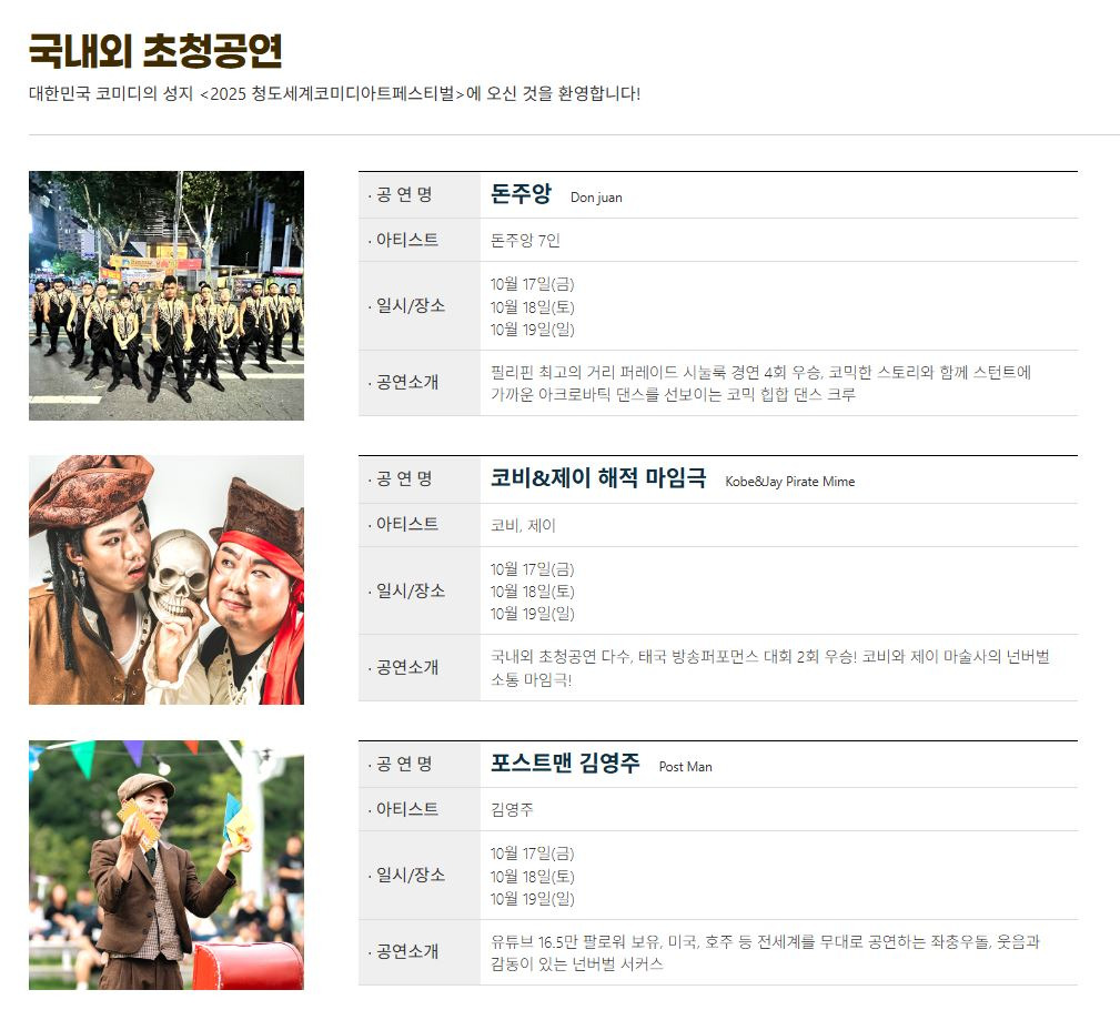 해외초청공연으로 코믹 아크로바틱 힙합 퍼포먼스 그룹 ‘돈주앙’, 국내초청공연으로 ‘소통왕 말자할매’, ‘투맘쇼’, ‘툴스 난타’, ‘김민형의 청도 매직쇼’가 관람객들에게 웃음과 즐거움을 선사합니다.