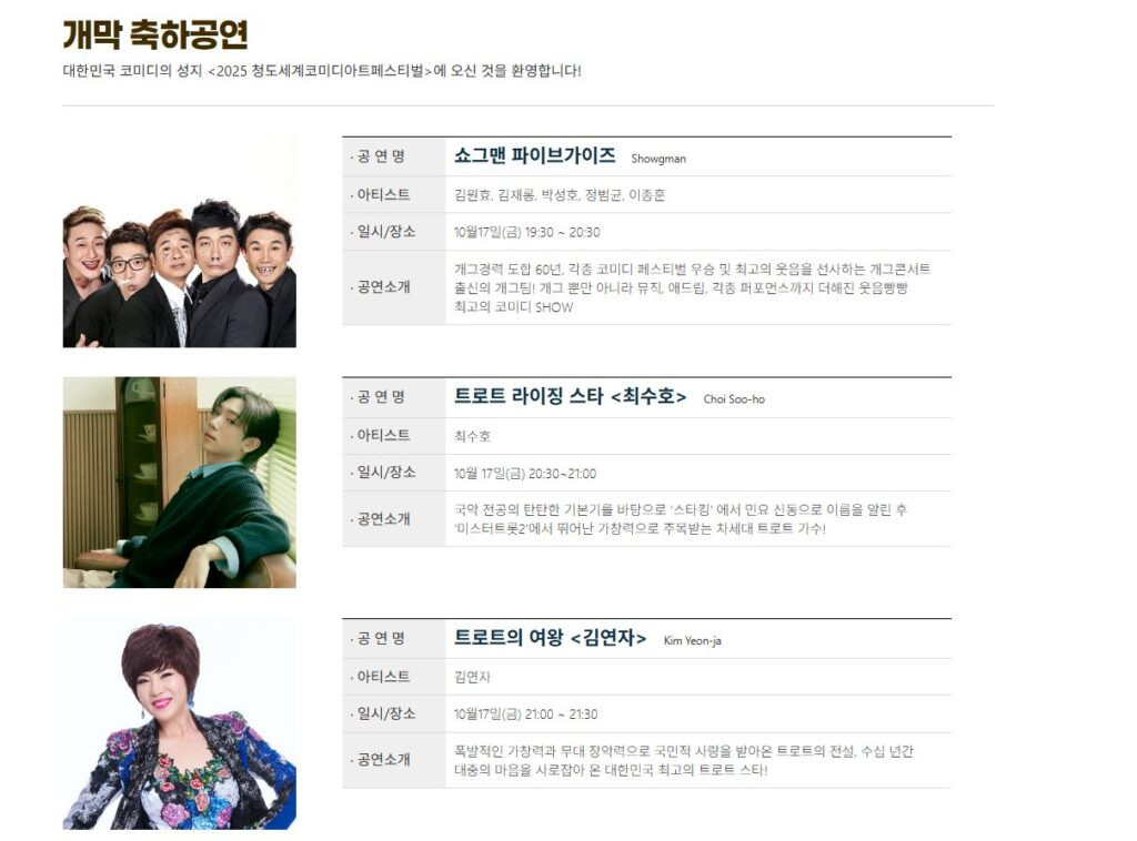 – 내 용 : 개그공연: ‘쇼그맨(박성호, 김원효, 정범균, 김재롱, 이종훈)’/’ 가수공연: 트로트의 여왕 ‘김연자’, 미스터트롯2 ‘최수호’
