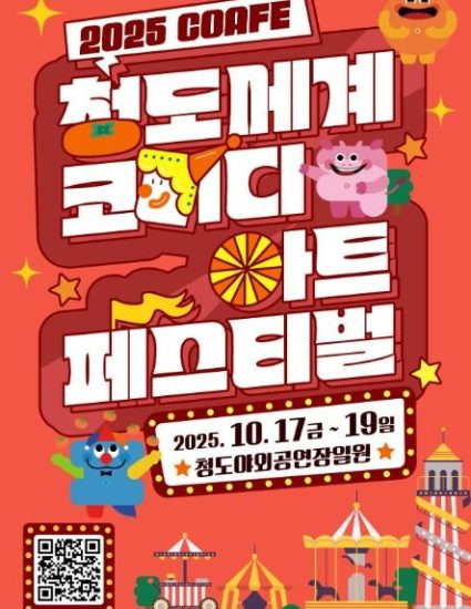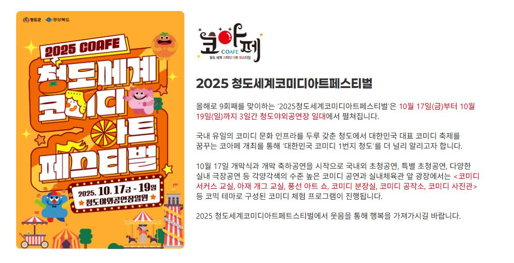 2025년 10월 17일 금요일부터 10월 19일 일요일까지 청도야외공연장 일원에서 청도반시축제와 함께 청도세계코미디아트페스티벌이 개최합니다.