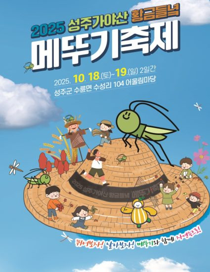 가야산과 대가천변의 청정자연을 자랑하는 대표적인 친환경 농촌체험 축제인 성주 가야산황금들녘메뚜기축제가 2025년 10월 18일부터 19일까지 2일간 성주군 수륜면 수성리 104 어울림마당 일원에서 개최합니다.