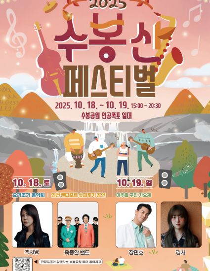 수봉산 일대 자연환경을 활용하여 지역주민 및 방문객들에게 수봉산 관광자원과 함께 문화예술 향유 기회를 제공해주는 관광연계형문화축제인 2025년 수봉산 페스티벌이 10월 18일부터 19일까지 개최합니다.